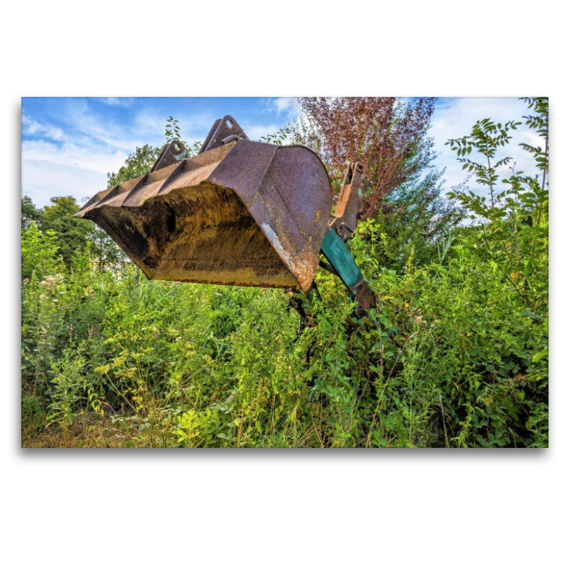 Verrosteter Stahl trifft auf wildes Grün: Die massive Schaufel eines alten Radladers ragt wie ein Fossil aus dichten Büschen hervor, fast vollständig von der Natur eingewachsen.