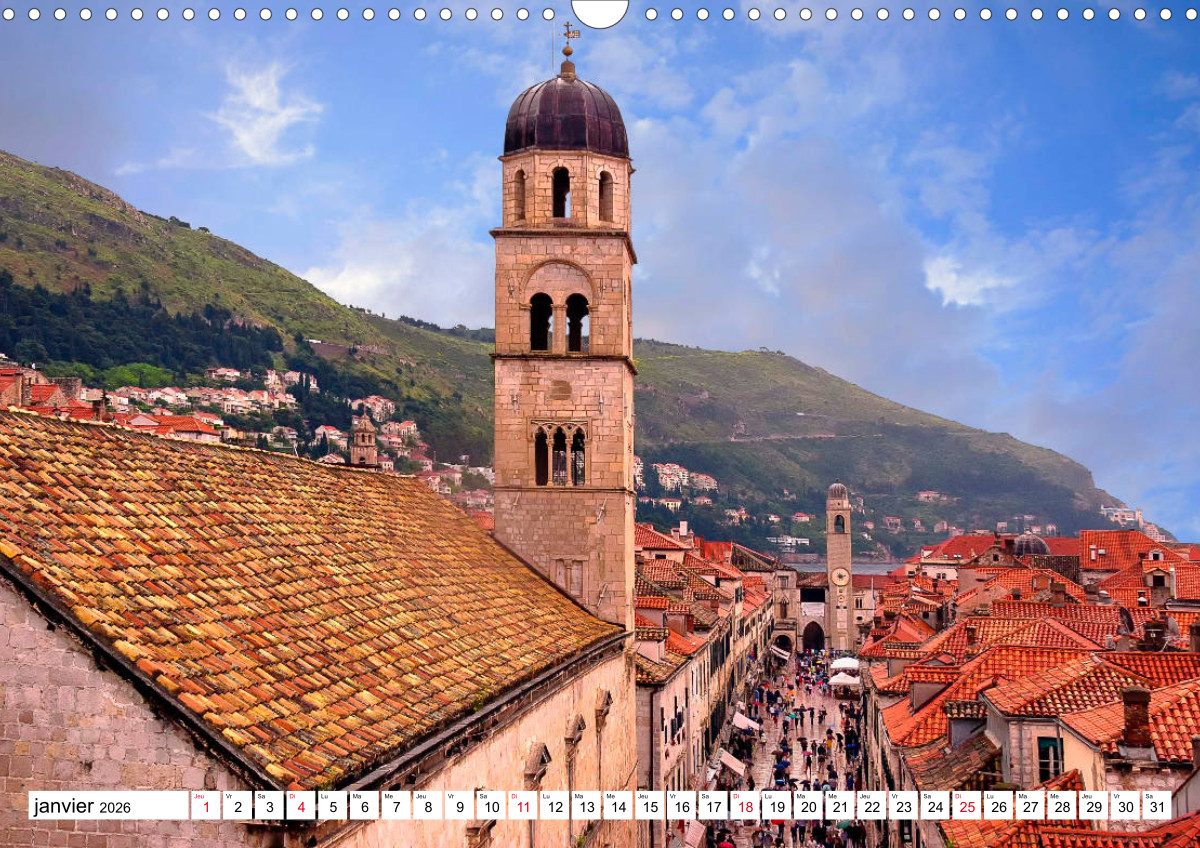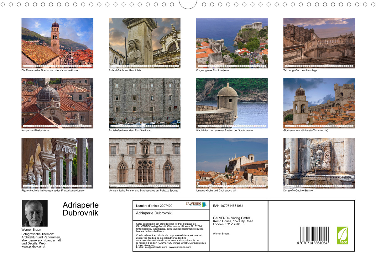 Dubrovnik liegt im südlichen Dalmatien auf einer gut befestigten, kleinen Halbinsel. Die reiche Stadt blickt auf eine bewegte Geschichte zurück. Zeugen davon sind prächtige Bauten in der Stadt: Kirchen, Klöster und Paläste, sowie eine mächtige Befestigung, welche die Altstadt umgibt. Was es in Dubrovnik alles zu sehen gibt, davon gibt dieser Kalender einen kleinen Einblick.
