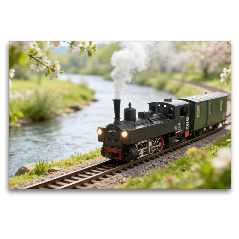 Eine Lokomotive mit Anhänger dampft durch das frühlingshafte Steyrtal. Hier wurde eine Modelleisenbahn wirkungsvoll in eine realistisch wirkende Landschaft integriert.