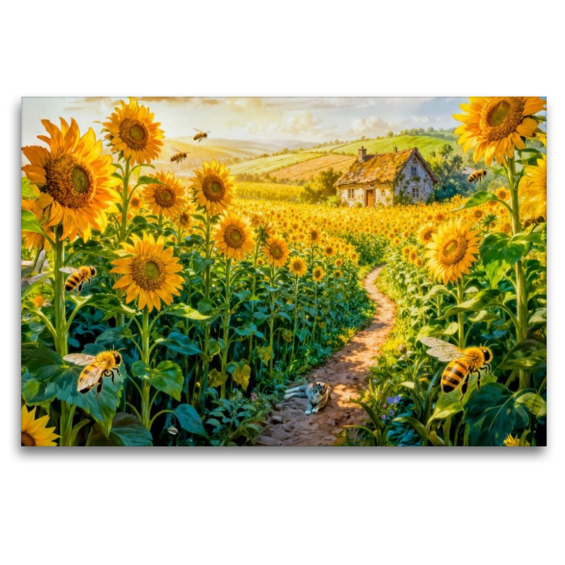 Ein warmes Sonnenblumenfeld umgibt ein kleines Cottage, während eine Katze gelassen auf dem schmalen Weg sitzt und die sommerliche Ruhe genießt. Die leuchtenden Farben, der sanfte Fantasy‑Charakter und die vielen feinen Details erinnern an die stimmungsvollen Szenen aus dem Kalender „Märchenhafte Cottages – Waldzauber und versteckte Tiere entdecken!“. Als Puzzle oder Leinwand bringt dieses Motiv eine sonnige, märchenhafte Atmosphäre in jedes Zuhause.