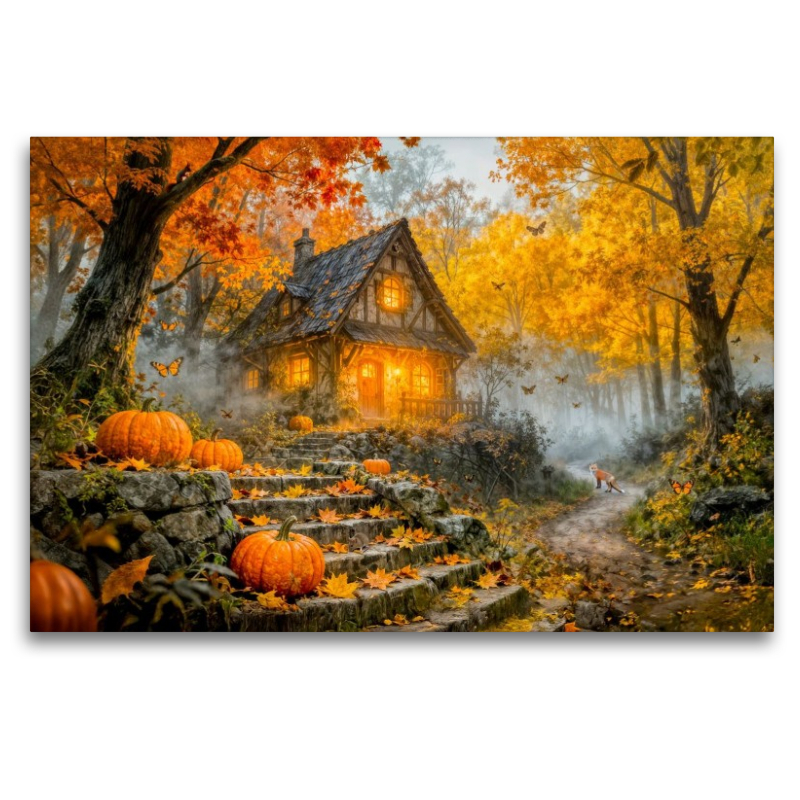 Ein herbstliches Cottage liegt eingebettet in einen farbenfrohen Wald, während ein Kürbis die Treppe hinauf zur Haustür schmückt und ein Fuchs ruhig auf dem Waldweg sitzt. Die warme Lichtstimmung, das bunte Laub und der sanfte Fantasy‑Charakter erinnern an die liebevollen Szenen aus dem Kalender „Märchenhafte Cottages – Waldzauber und versteckte Tiere entdecken!“. Als Puzzle oder Leinwand bringt dieses Motiv eine gemütliche, märchenhafte Herbstatmosphäre in jedes Zuhause.