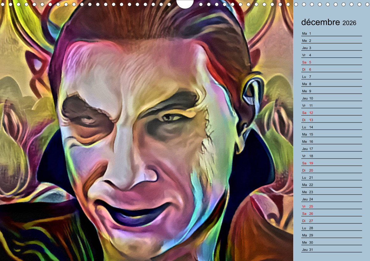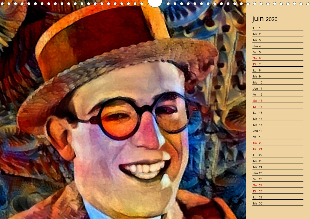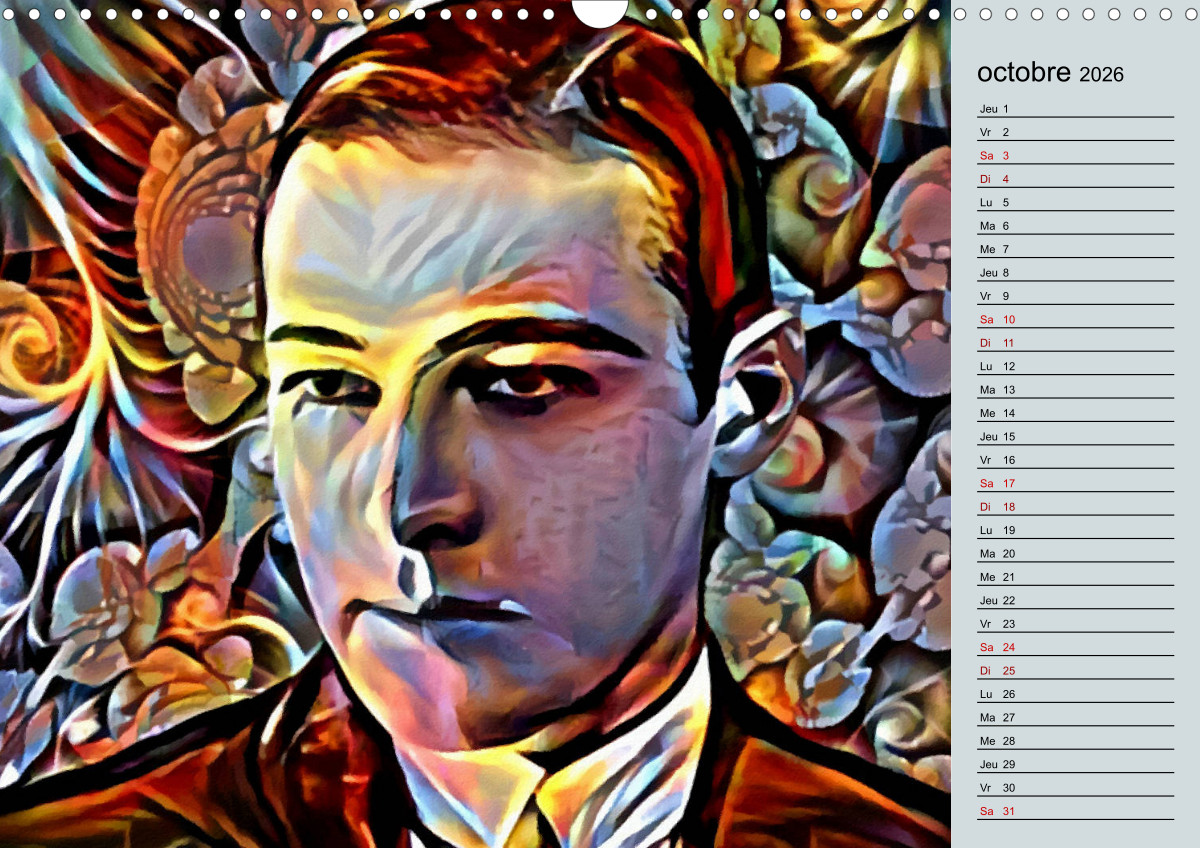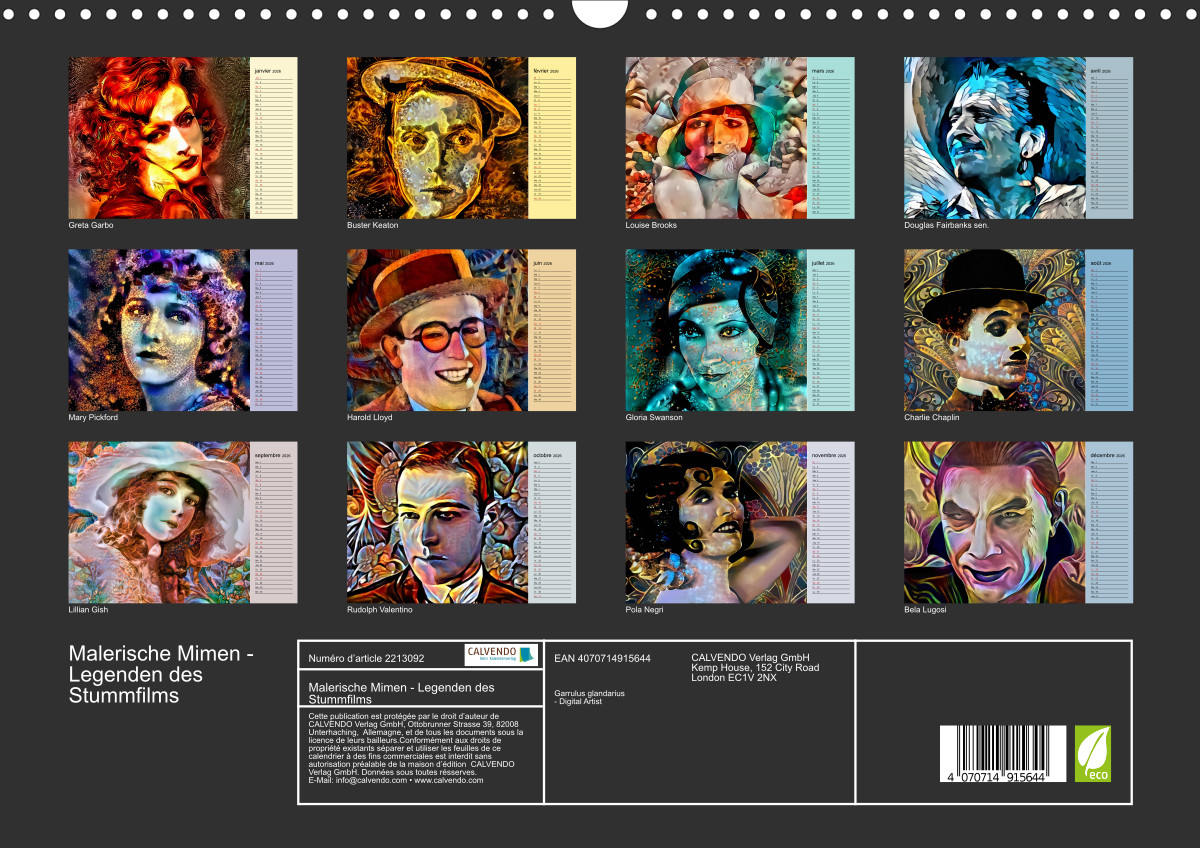 Erinnern wir uns daran, wie die unvergesslichen Legenden der Schwarzweißfilmzeit Spannung, Vergnügen und Emotionen in unser Leben brachten. Obwohl sie uns vollkommen monochrom und stumm erschienen, schenkten sie uns doch die farbenprächtigsten Momente, während wir ihr Schauspiel auf der Kinoleinwand genossen. Die Portraits in diesem Kalender sind ein Versuch, etwas Farbenpracht an sie zurück zu geben – einfach nur zum Dank.